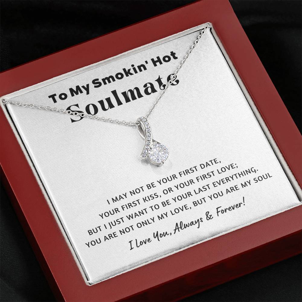Melt her heart with this ALLURING BEAUTY necklace gift! The petite ribbon shaped pendant is finished with 14K white gold over stainless steel, and is embellished with dainty clear crystals surrounded by a sparkling 7mm round cut Cubic Zirconia.